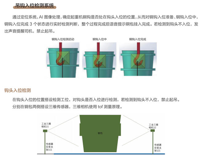 近年來,冶金行業(yè)智能化、自動化、云時代等大數據廣泛應用,煉鋼車間是冶金行業(yè)的重點區(qū)域,廠區(qū)設備復雜、環(huán)境差、安全隱患多等因素更需要進行設備自動化、智能化的升級管理、實現(xiàn)廠區(qū)無人化智慧工廠目標的發(fā)展。起重機作為煉鋼、煉鐵、軋鋼車間的主要設備,起重機工作中對在工位操作越來越精準,需要駕駛員及時準確觀察工位狀態(tài),由于駕駛室的位置和現(xiàn)場的工況環(huán)境影響經常引起操作失誤,鋼包起吊安全事故頻發(fā),特別是對于鋼包掛鉤是否完整嵌入掛耳,是否進入正確的起吊姿態(tài)沒有直接的判斷和監(jiān)控。研發(fā)起重機鋼包定位掛鉤識別管理系統(tǒng)是安全生產的剛性需求。